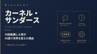 ケンタッキーフライドチキンの店頭に立つ、白いスーツに黒縁メガネのおじいさん。誰もが知るあの姿は、実在の人物をモデルにしたものです。しかし、その創業者カーネル・サンダースが、KFCを本格的に立ち上げたのが65歳のとき、しかも無一文からの再起だ...
